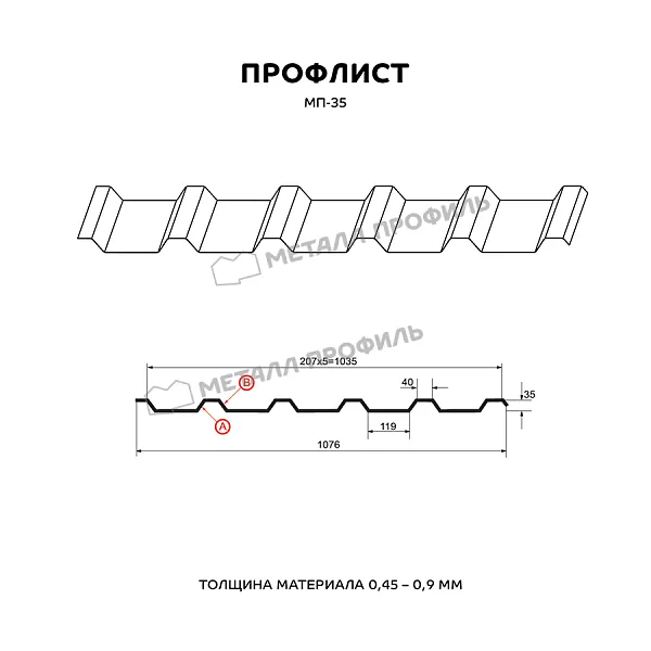Профлист МЕТАЛЛ ПРОФИЛЬ МП-35x1035-B (ПЭ-01-9002-0,7) — популярный материал для обустройства профилированного листа. Представляет собой металлический оцинкованный лист с покрытием. Общая толщина металла с цинковым и декоративно-защитным слоем составляет 0.7 мм. После проката на специальном оборудовании сталь приобретает рисунок из повторяющихся волн. Жёсткость такого листа на порядок выше плоского.Профиль МП-35:
